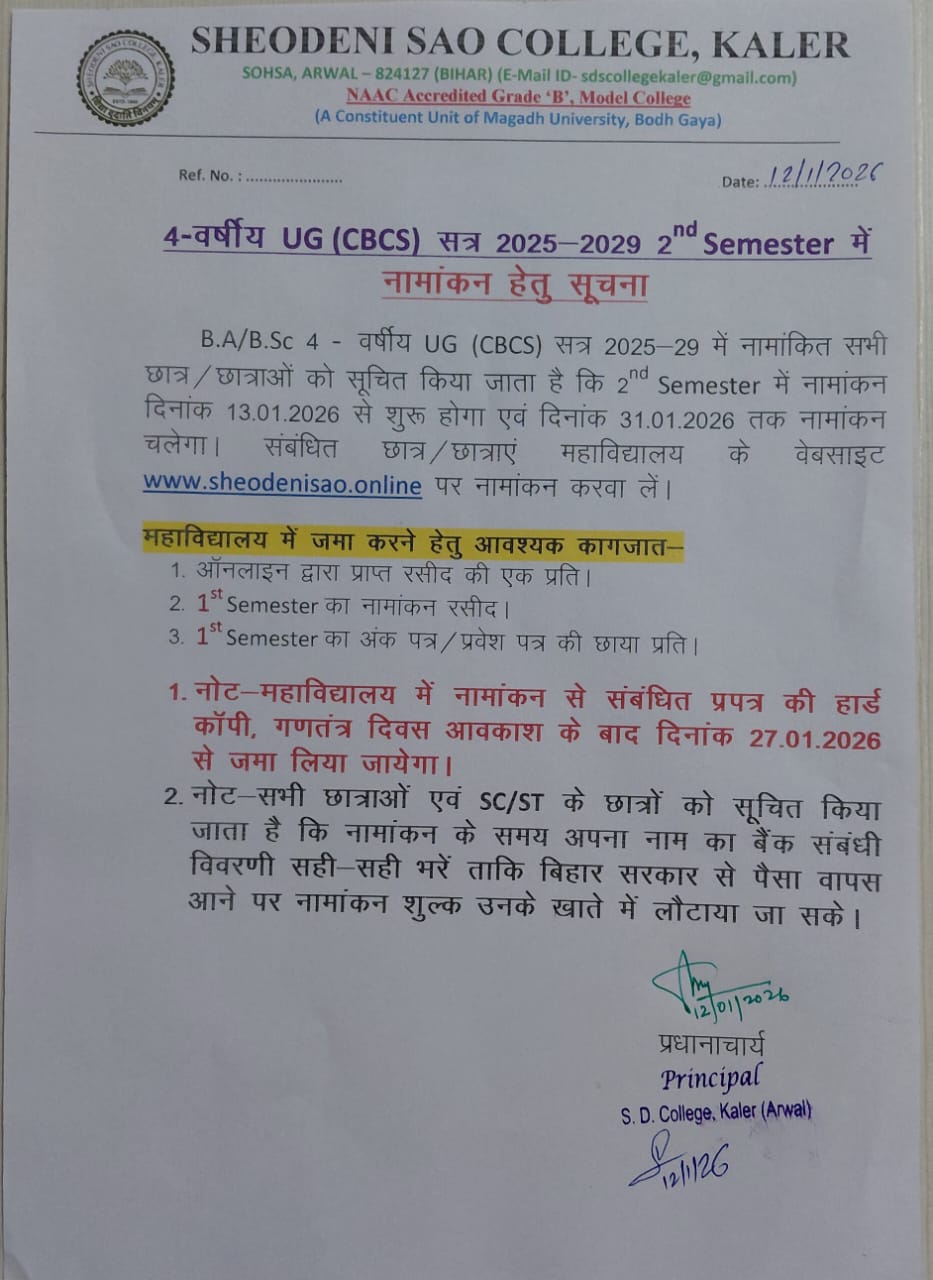 NOTICE REGARDING UG 2ND SEMESTER ADMISSION (2025-29) ADMISSION